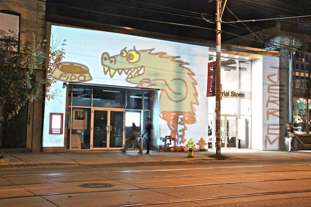 Using a mobile projection unit (pictured here) consisting of a digital projector, iPad, and a mobile power source, Jerrem hits the streets and paints digitally onto buildings. Painting buildings in this way is a great way to make large artworks in a very short period of time. Each painting is drawn live and is gone as soon as the power is turned off. This form of electronic art is often referred to as guerilla projection, projector bombing, or street projection.